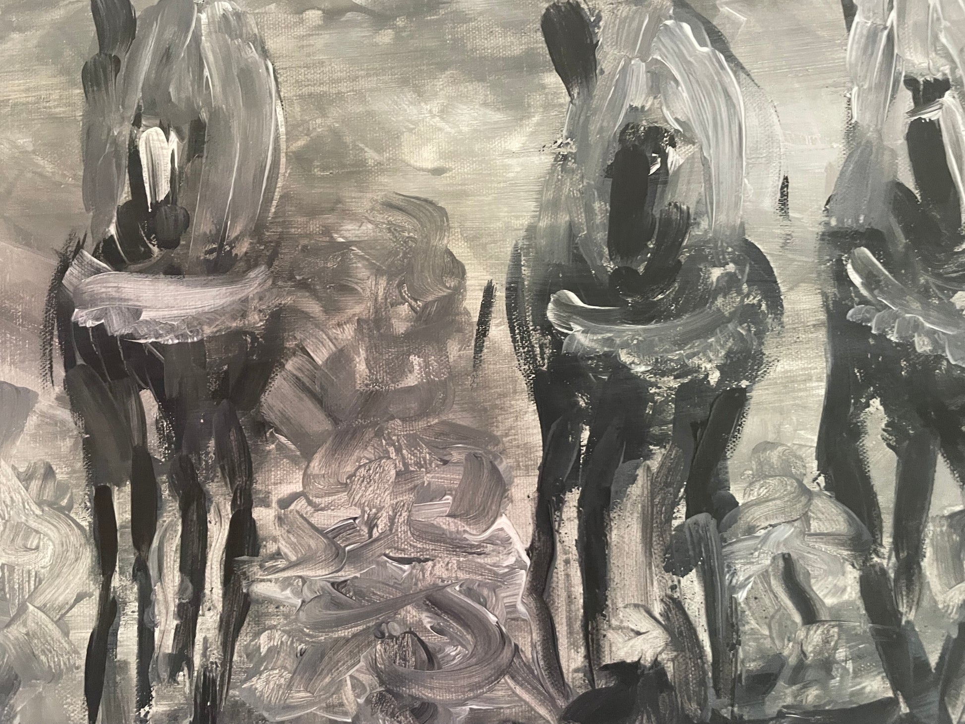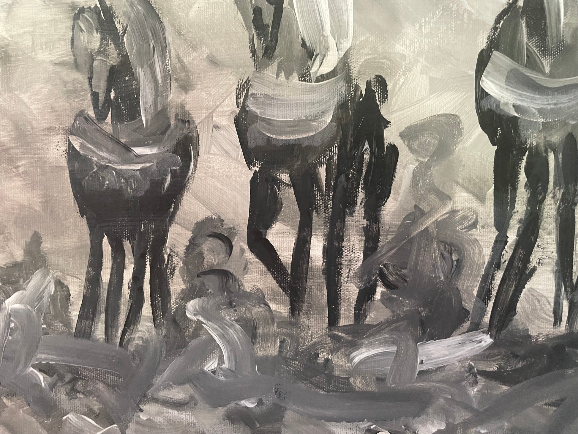 Moroccan Tbourida, ( fantasia) The painting is a monochromatic, black‑and‑white acrylic work depicting five horsemen riding in a line across a rugged, textured foreground. Each rider wears a hat and holds a long rifle upright, suggesting a military or historical cavalry scene. The brushwork is expressive and thick, giving the sky and ground a stormy, atmospheric quality with heavy impasto strokes that convey movement and tension. The figures are rendered in dark silhouettes against a lighter.